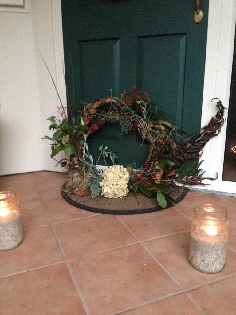 I lean the wreath against the door.   I move the candle jars a little further away.   In the dark all I can see are the flames.   I feel incredibly sad – the same sadness I felt last night when I read that crew list. It’s so matter of fact “….four dead one POW…” .