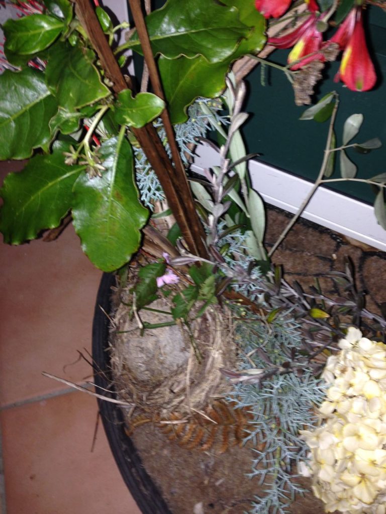 I add a bird’s nest. I tie it on with a thin criss-cross of pale green flax.