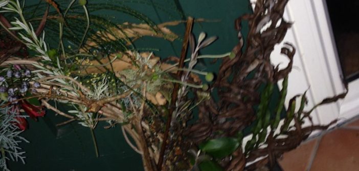 I cut the Magnolia where it reaches into the driveway and find one of last year’s Hydrangea heads, almost translucent now. Branches from the Airforce blue conifer. A small twig from one of the cherry trees fuzzy with pale green lichen; a still gleaming chestnut. Three orange red Astralomeria. Rosemary and Olive from the paddocks. And one of the improbable pale pink blossoms the dying Cherry tree is displaying.