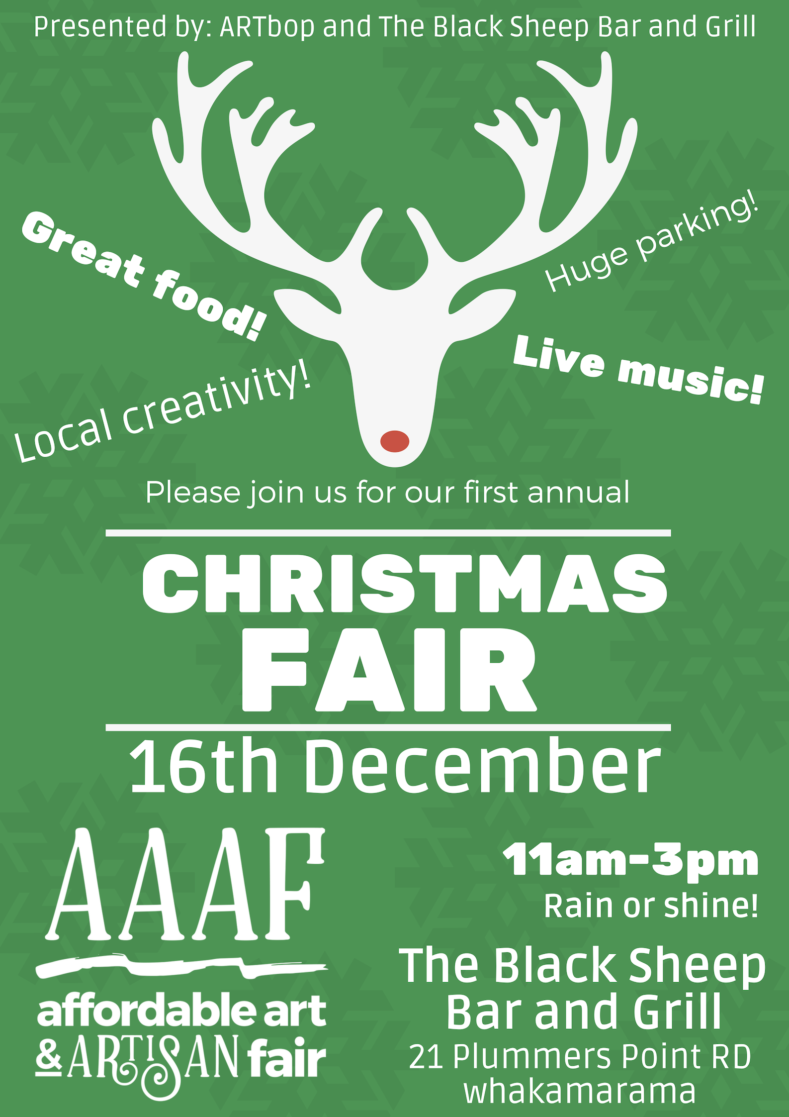 The next Affordable Art & Artisan Fair will be on Sunday 16th December 2018 – Fairs for the other months are held on the last Sunday of the month. The Fairs are held within the Black Sheep Cafe & Restaurant complex on the last Sunday of every month 11am to 3pm. There is heaps of parking, clean toilets and wonderful food and coffee. There’s live music. There’s an event prize you can win. If you would like to join us as an exhibitor/retailer of your original creativity or artisan products you can contact us at aaafair17@gmail.com We are sign posted along SH2 with signage to the turnoff of SH2 and Plummer’s Point Road. You won’t be able to miss us! We’re indoors over winter months and outside in the Summer. Look at this beautiful poster created by Birgitt Shannon and Nathalie Foster of the Fair’s Marketing and Promotions team.