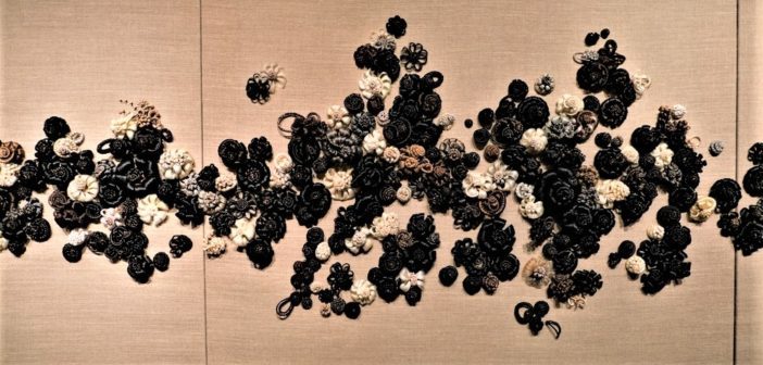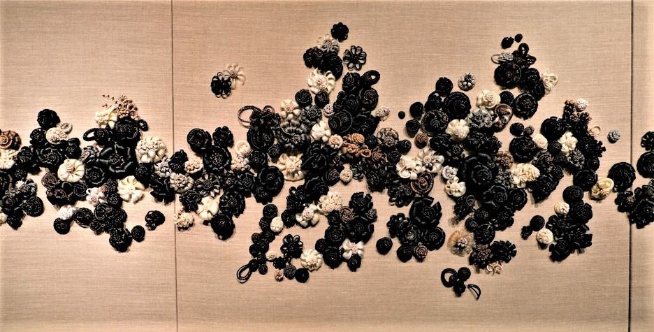 This art work, completed in 2015, The Horses Stayed Behind, is composed of 500 horse hair rosettes from 500 NZ horses and ponies. Traditionally, Victorian hair wreaths or rosettes represented a deceased person, or often, a particular event causing the hair to be removed and placed in jewellery.