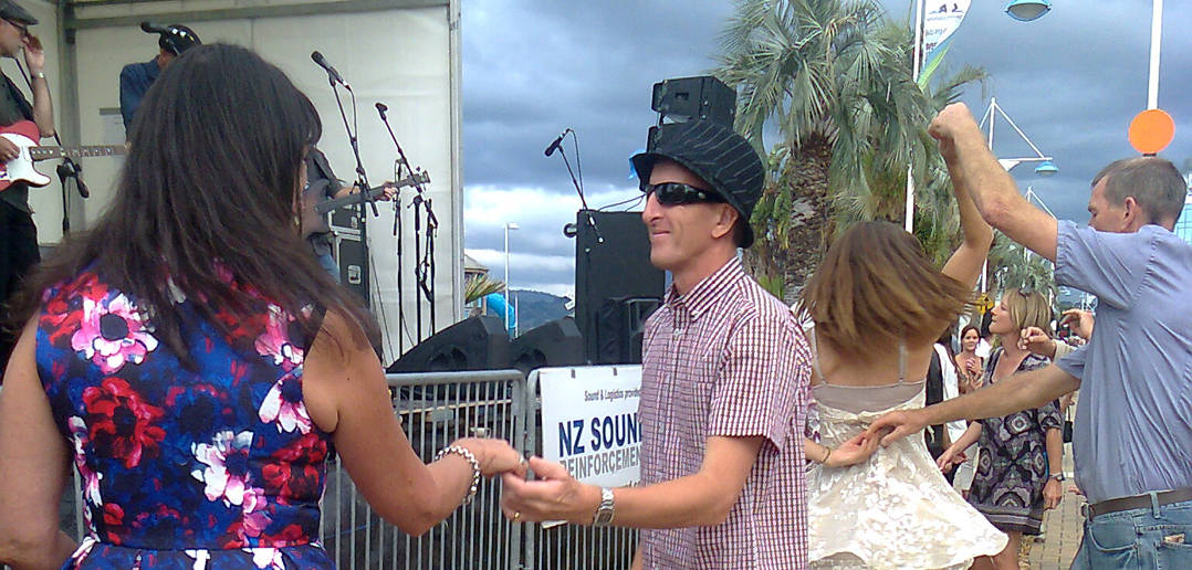 Sunday’s programme was just as varied with another packed out Downtown Carnival from 12pm – probably the best value gold coin’s worth of anything, anywhere at anytime! Sunday also had a variety of paid indoor events. The smooth and mellow New York style of Dee DeLuca could be heard at Trinity Wharf between 12pm-2pm. I’ve seen Dee DeLuca perform before on the little permanent stage area of the waterfront – (both of us coated up against the water’s penetrating cold) instantly transporting the outdoor audience to a traditional jazz club. 3pm saw “Two New Zealand icons blending the best of classical with the best of jazz. Classical piano maestro Michael Houston and renowned jazz artist Rodger Fox…” That’s the Rodger of the Rodger Fox Big Band of my earlier years in Auckland! At 7pm on Sunday Darren Watson (who recently played the Marchwood Blues Festival) could be heard with Radius in the Baycourt X Space. 8pm brought Fiona Pears “Swing Driven Thing” onto the Addison Theatre stage and a little bit later that evening Sunday night’s Hurricane Party at MauaoPAC had a Room Full of Blues with Brilleaux and The Hipshooters.