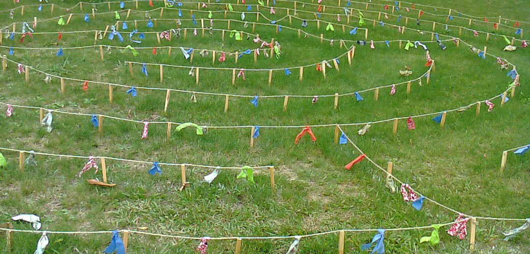 It’s a Christian Easter message. The handwritten banners are acompanied by a simple peg and string maze on the grass in front of the church. As instructed I take two of the fabric strips, walk into the maze and tie my strips to the circular string. My ties join a myriad of other multi-coloured fluttery strips.
