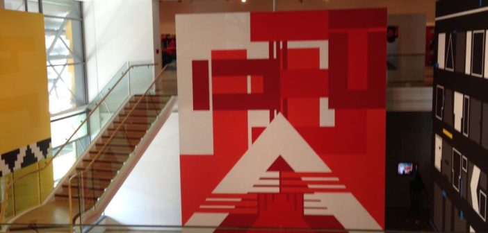 Taratoa’s painting on the soaring walls of the Atrium of the Tauranga Art Gallery, contemporary interpretations of tukutuku, are so bright and vibrant you draw in a breath.