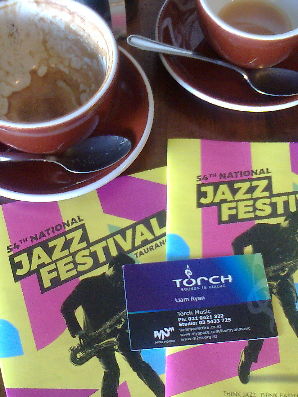 I’m meeting Liam Ryan, the Director of the National Youth Jazz Competition, at Alimento Cafe on 1st Avenue Tauranga. I’ve never met Liam before so at the appointed hour when a besuited man enters Alimento I leap to my feet and introduce myself – it’s not Liam. But, we both laugh He has no idea what the person he’s meeting looks like. He positions himself at the very street edge of the cafe at a table under one of the umbrellas rather like a trapdoor spider waiting for its unsuspecting prey. I continue to lurk inside at my appointed table. I’ve never worked out whether the tables are too high, the chairs too low or I’m anatomically incorrect but I have to sit on my “cardi” to be able to comfortably reach and write.