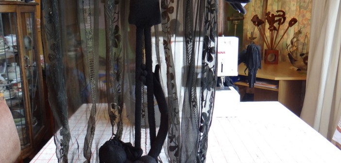 Maureen Murdoch’s groundbreaking book, The Heroine’s Journey: Woman’s Quest for Wholeness, published by Shambhala Publications in 1990, was written as a response to Joseph Campbell’s book on the hero’s journey, and Liz’s Heroines’ Journey series in response to this work is very intimate and tender. It has an added element – a crone-like lace-clad doll standing on a narrow boat, shrouded in black, clutching her coin. As Liz explained : “At the end of any experience in life, we have to pay the ferryman to get to the other side, and decide : what is next”.