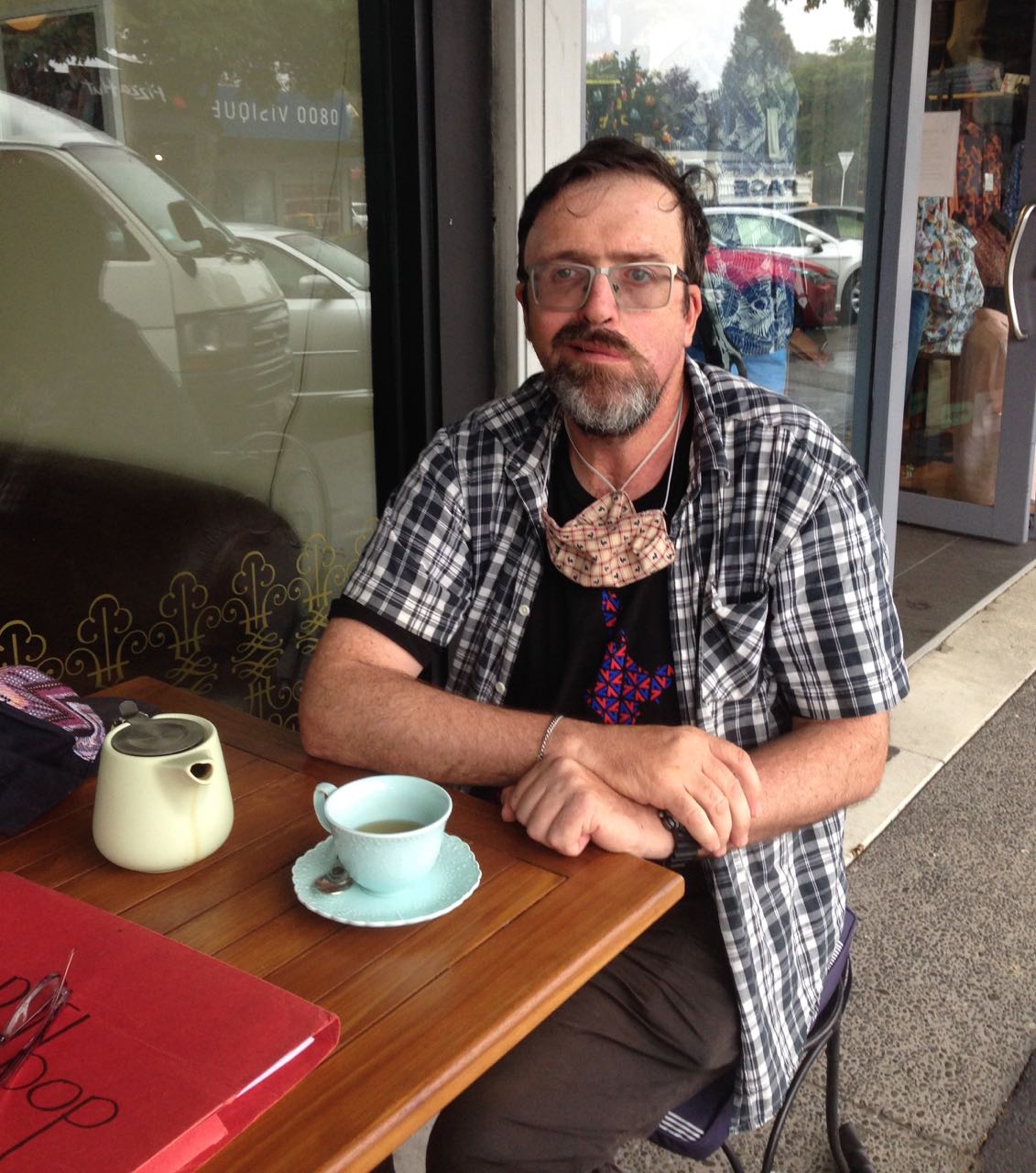 Nick Scott having tea with ARTbop at Le Chat Noir in Greerton