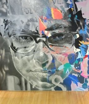 Askew One is a New Zealand born street artist now based in Brooklyn, New York. Visitors to the exhibition will be instantly introduced to him when they encounter his floor-to-ceiling painting, an arresting, detailed portrait layered with bold colours and typography.