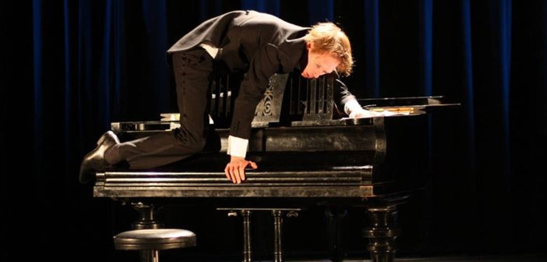 How lovely it was to see some fun made of The Piano. It started life in the show as a stage. Slippery, but reliable. And high. Irreverently, it lost its leg, causing an amazing fox-and-goose problem as The Pianist sorted out the relative benefits of having an instrument that would stay on the level while also allowing him somewhere to sit and play. There were lots of jokes about the what-we-sit-upon, which certainly suited a full-house audience that – refreshingly different from your usual Baycourt attendees – ranged from young front-row commentators delighted to point out the dangers confronting him (and others prepared to pat him on his sit-upon) to equally young back-row protagonists actively prepared to take him on.