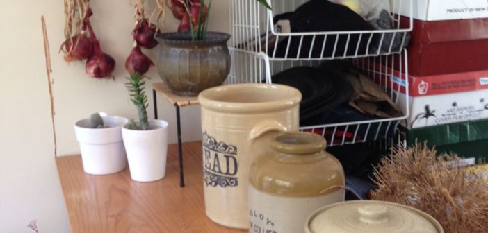 I have vases and containers for flowers and plants. Plant food and labels and all sorts of saved plastic containers just in case I want to take a cutting (or two thousand). I have old wicker baskets for flowers. I’ve managed to Condo them into two piles on top of a shelf. I have old enamel and iron ware. And I have two beautiful new containers Carolyne gave me by the door on the desk that used to be part of the receptionist’s area in the office. I don’t throw much away. There’s a lot in this garage and the little room adjacent to it.