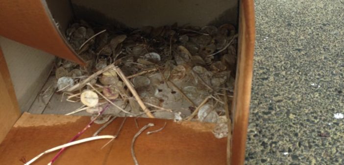 I slowly (partly because of how much stuff is in the garage) walk around and have a look. In the aisle of the freezer and storage boxes (neatly labeled) I find someone has been smashing my dried honesty. Really, I only boxed that yesterday, or the day before. Both the little grey mouse traps have gone off. But today there is no sign of a small grey corpse. All the shopping bags have been moved and trampled on. I gingerly move towards them.