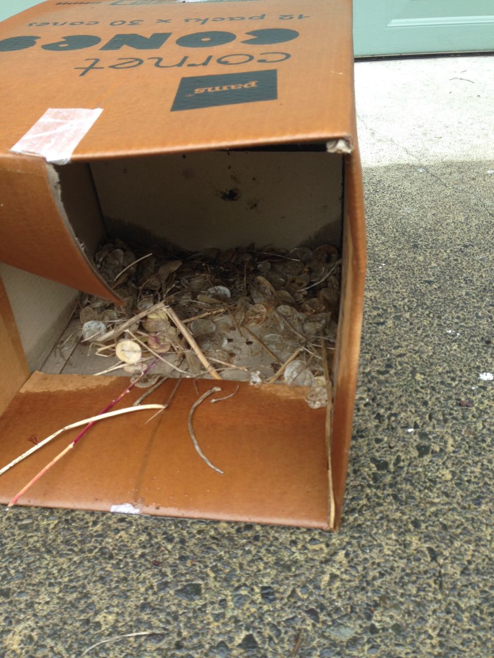 I speak sternly to it. I tell it I’m going to take the box outside and I expect him (it’s definitely not a girl. What girl would get stuck in the bottom of a huge cardboard box in my garage and wreck my dried flowers) to go back into the garden and NOT come back into my garage EVER. If you heard me talking to a box tonight – this is the explanation.