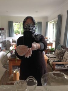Here masked, goggled and gloved to go down to the chemist for a prescription.