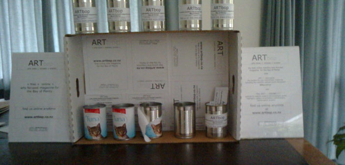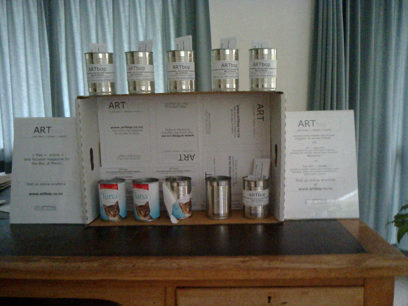 So I did – create something for ARTbop and enter it. Well that’s not quite it – I’ve entered the advertising and promotional “tools” we’ve been using at ARTbop since we started in 2009. Recycled, repurposed, scavenged and scrounged. You may have seen one of our “tins” in the Cargo Shed, Creative Tauranga, the Tauranga Public Library, the headquarters of the Western Bay of Plenty District Council. No – well have a look.
