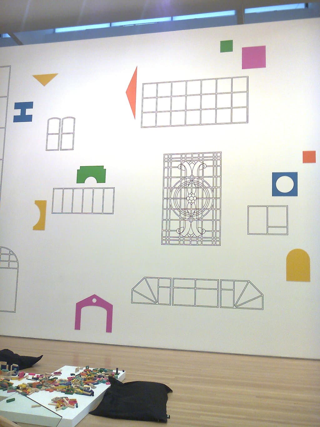I’ve positioned myself on the bench under the main Gallery stairs. The ground-level platform holding the collection of wooden building blocks has been pushed to the rear wall of this area and is surrounded by children and young people who’ve been creating shapes and structures since the opening commenced.