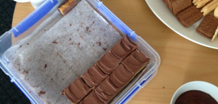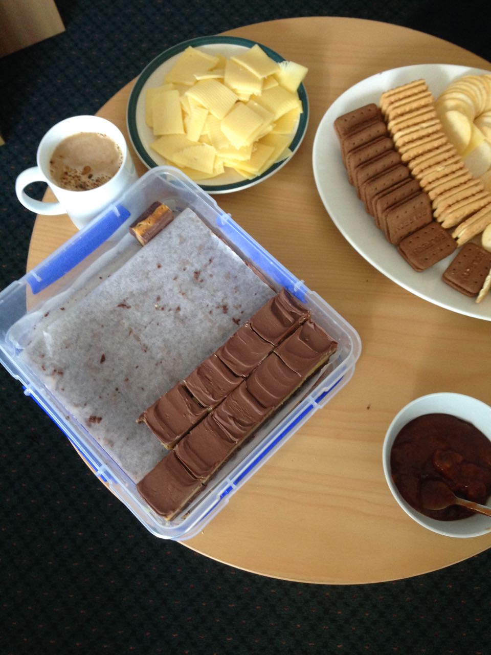 Sharon’s famous caramel slice with its rich (and thick) chocolate topping
