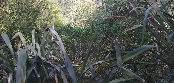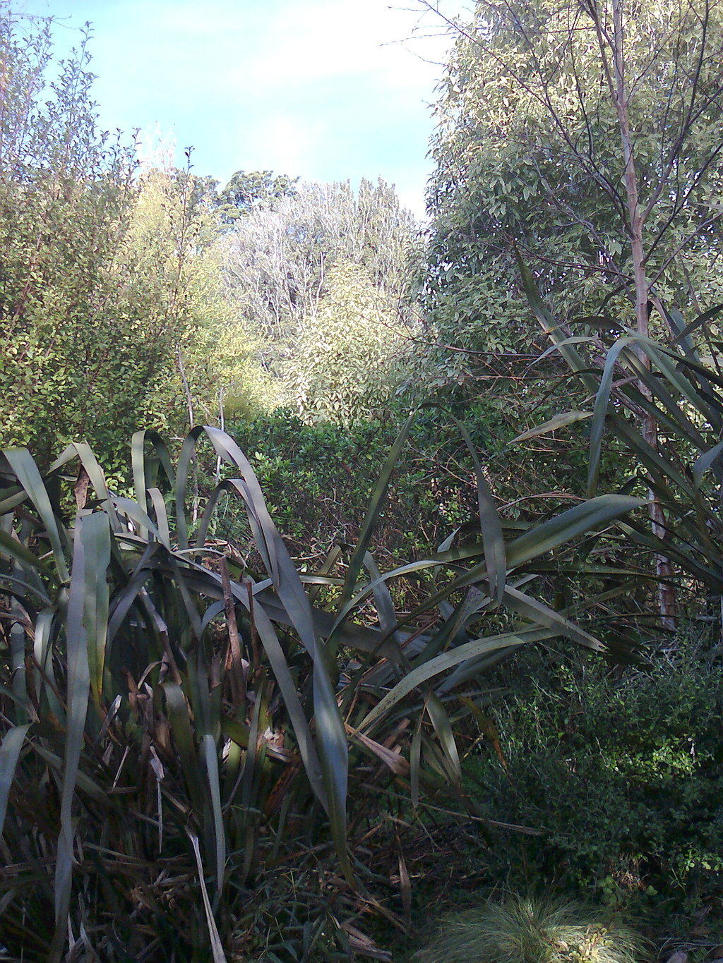 Tuis frequent the lower level flaxes, swinging upside-down cirque-like to get at nectar. Family groups sing a variety of tui tunes and I get to see that tuis are not black and white but oversprayed with a brilliant perlescent blue sheen. The kingfisher, kotare, likes to sit on the top of the old wire gate with his back to me and the sun. The fantails, piwakawaka dart and jump and flutter in front of the windows. There was even a shining cuckoo out the back the other day. And through the paddocks round the house I hear the penetrating chant of the interloping pheasant. Large kereru, the native wood-pigeon whoosh above me moving from the ancient trees over the road down to the Puketoki Reserve.