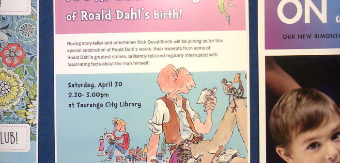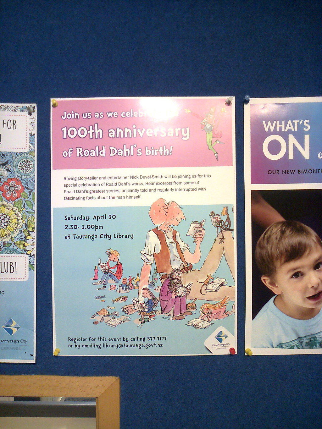 I’m intrigued by the notice on the Tauranga City Library wall. An invitation to acknowledge the 100th Birthday of the author Roald Dahl.